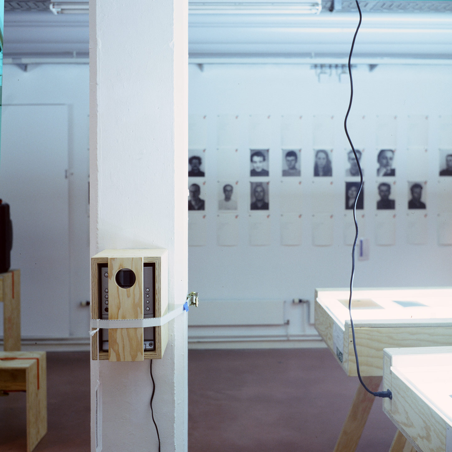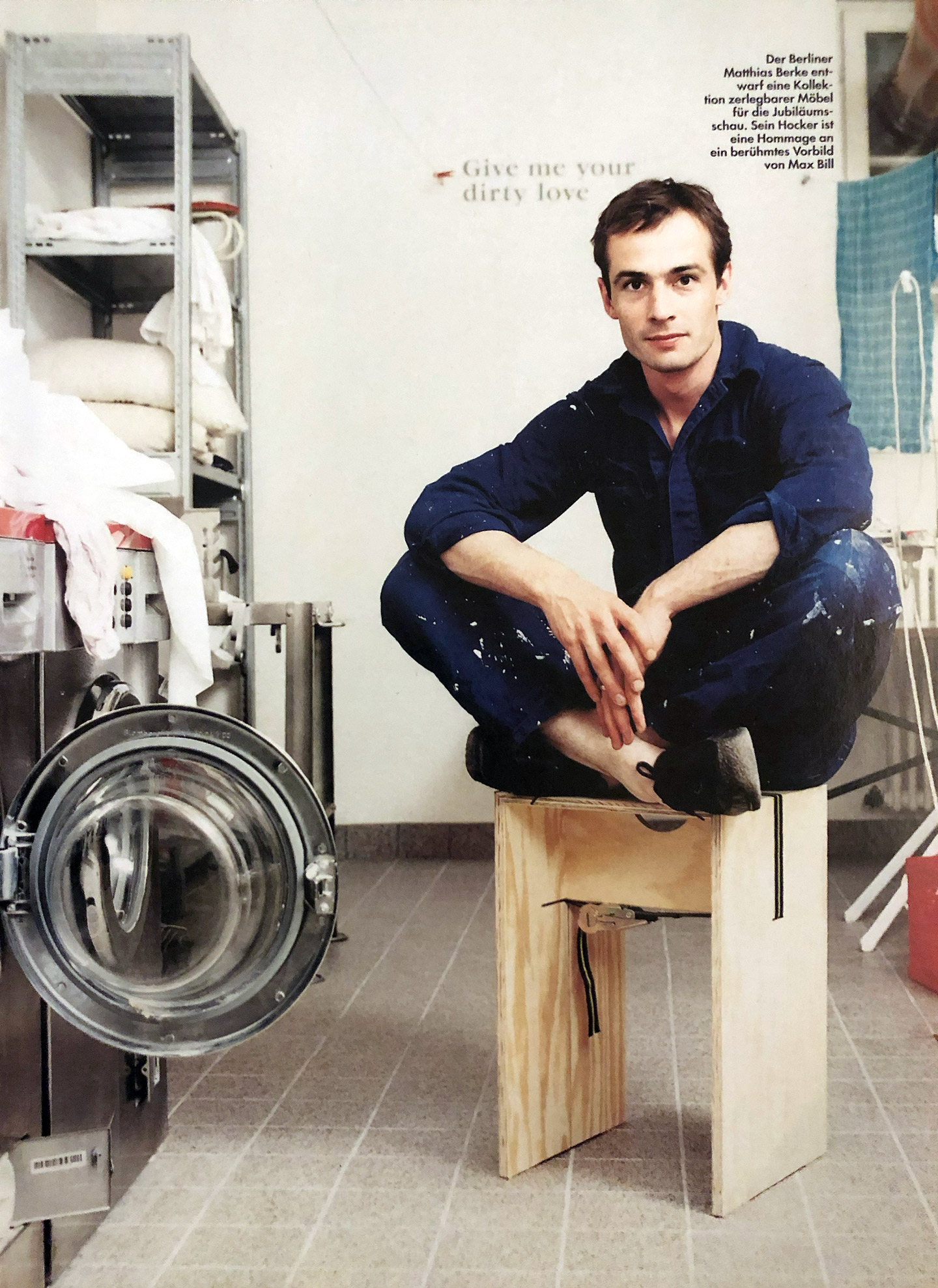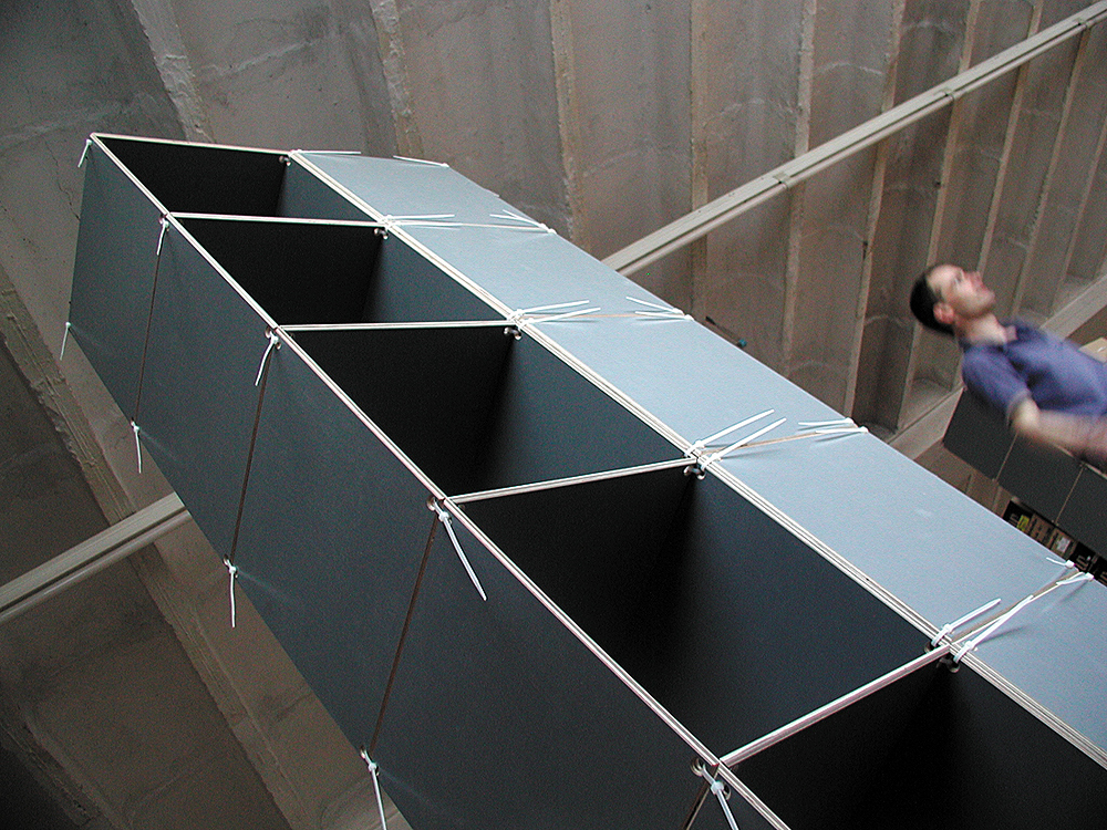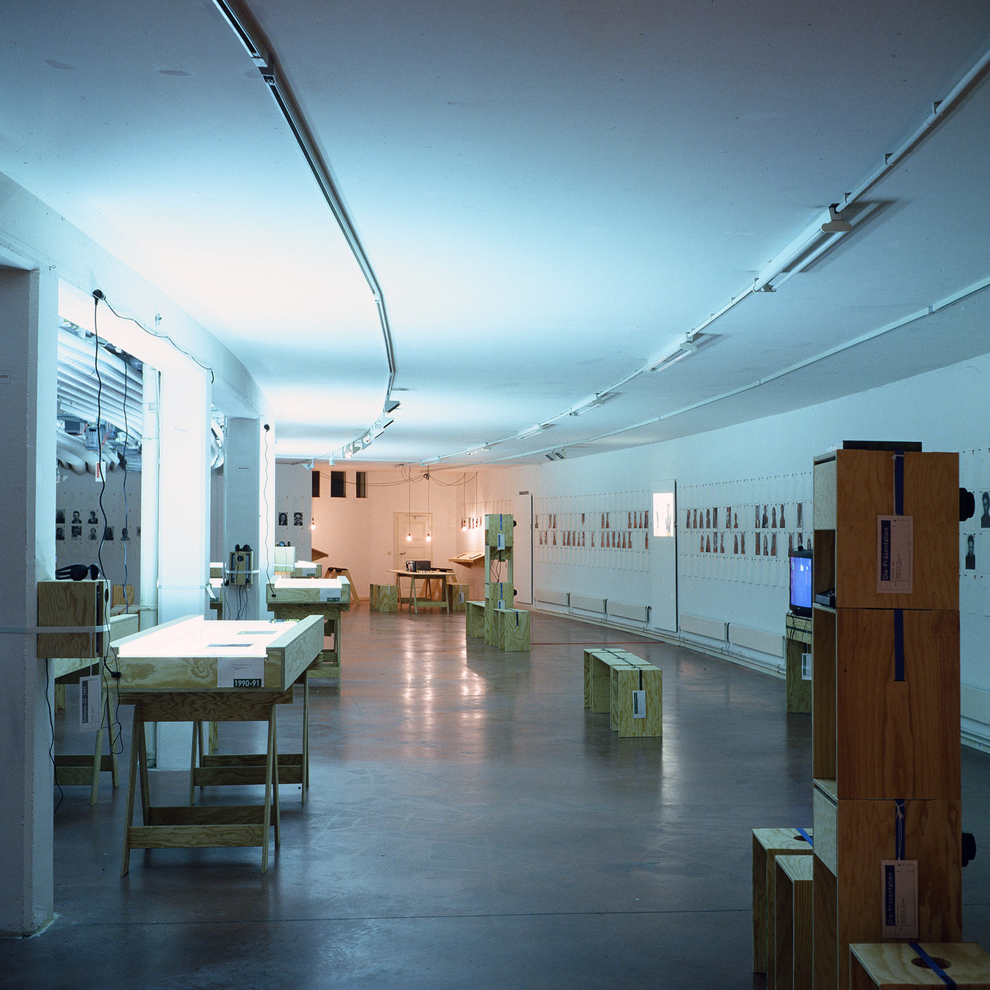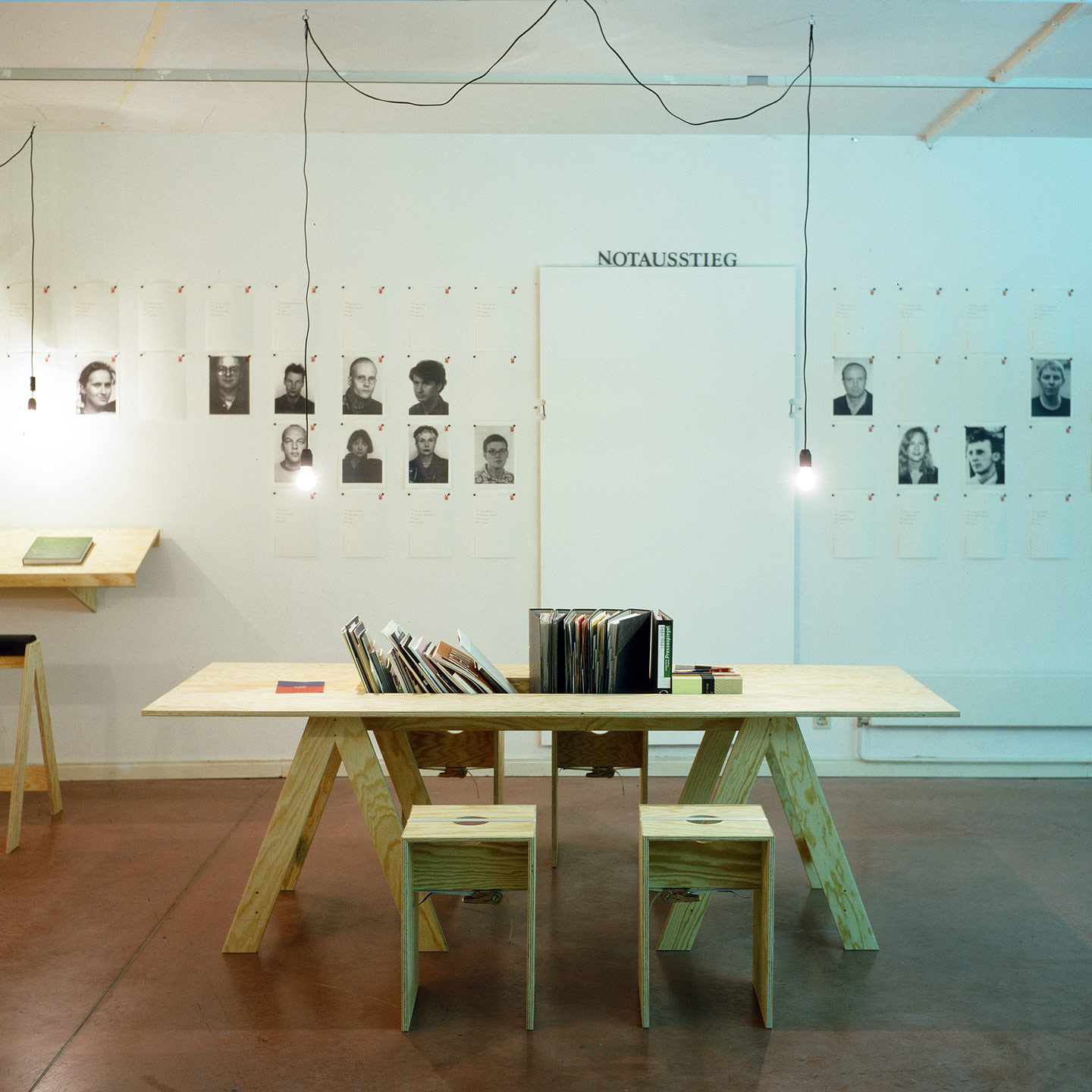 Für die Archivausstellung entwickelte ich mit Claire Angelini (Konzeption und Recherche) und Markus Julian Meyer (Architektur und Ausstellungsfotografie) ein zerleg- und stapelbares Sitz- und Raummöbel, das mittels eines umschlingenden Zurrgurts ohne Schrauben oder Leim zusammengehalten wird. Stapelbare Tisch- und Sitzgestelle mit unterschiedlichen Auflagen ergänzten die temporäre Möblierung.